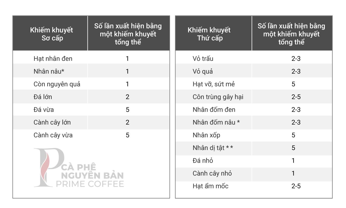 Theo Hiệp hội Cà phê đặc sản của Mỹ (SCA) một số khiếm khuyết (lỗi) có thể dễ dàng nhận thấy và ảnh hưởng nghiêm trọng đến hương vị cà phê sau khi rang, trong khi một số khác thì khó nhận ra với sự ảnh hưởng ít nghiêm trọng hơn. Do vậy để đánh giá mức độ “lỗi” của chúng, ta phải làm quen với với ba khái niệm chính, bao gồm: Primary Defect, Secondary Defect và Full Defect.