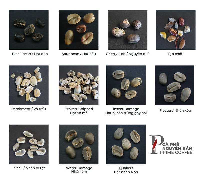 Tiêu chuẩn quốc gia TCVN 4193 : 2014 cho việc phân loại khuyết tật trên cà phê nhân Robusta và Arabica tại đây.
