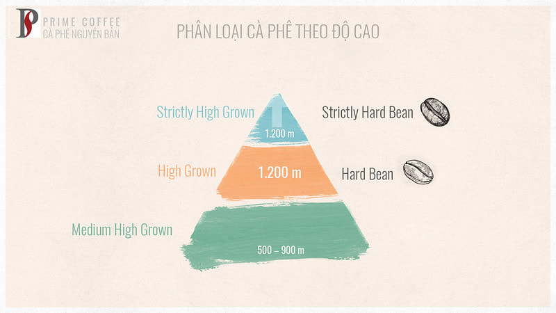 Thông thường cà phê được phân chia theo ba mức độ cao canh tác. Từ 500 – 900m/trên mực nước biển ; 900 – 1200m ; và trên 1.200m. Với tiêu chí này, loại cà phê nào được canh tác càng cao, thì càng thể hiện tiềm năng hương vị tốt hơn