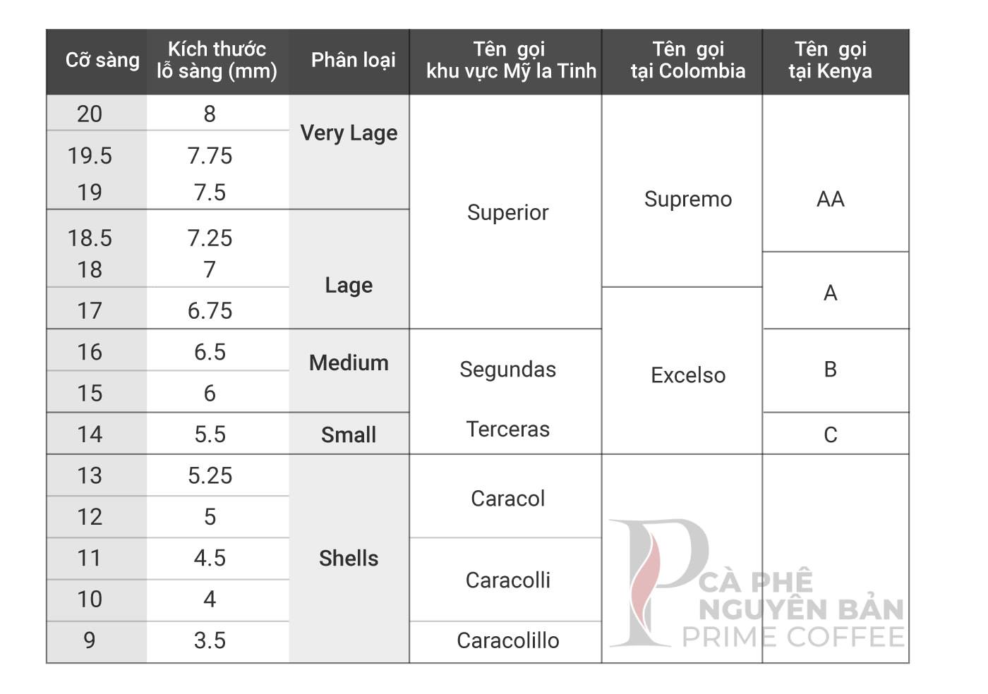 Cần lưu ý: Thông thường, các sàng số chẵn được sử dụng phân loại hạt Arabica và sàng số lẻ được sử dụng cho Robusta. Do đó, một lô Arabica được phân loại ở trên sàng 18 về mặt kỹ thuật có thể gọi là 17/18.